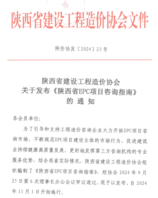 陕西省建设工程造价协会关于发布《陕西省EPC项目咨询指南》的通知